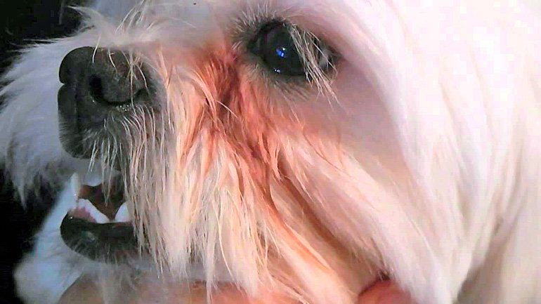 Esta secreción que cae abundante desde el ángulo del ojo acaba por provocar la coloración marrón-rojiza del pelo de la zona. Esto hace que parezca que el perro tenga el área periocular siempre manchada. Este fenómeno es especialmente visible en los perros de color blanco.